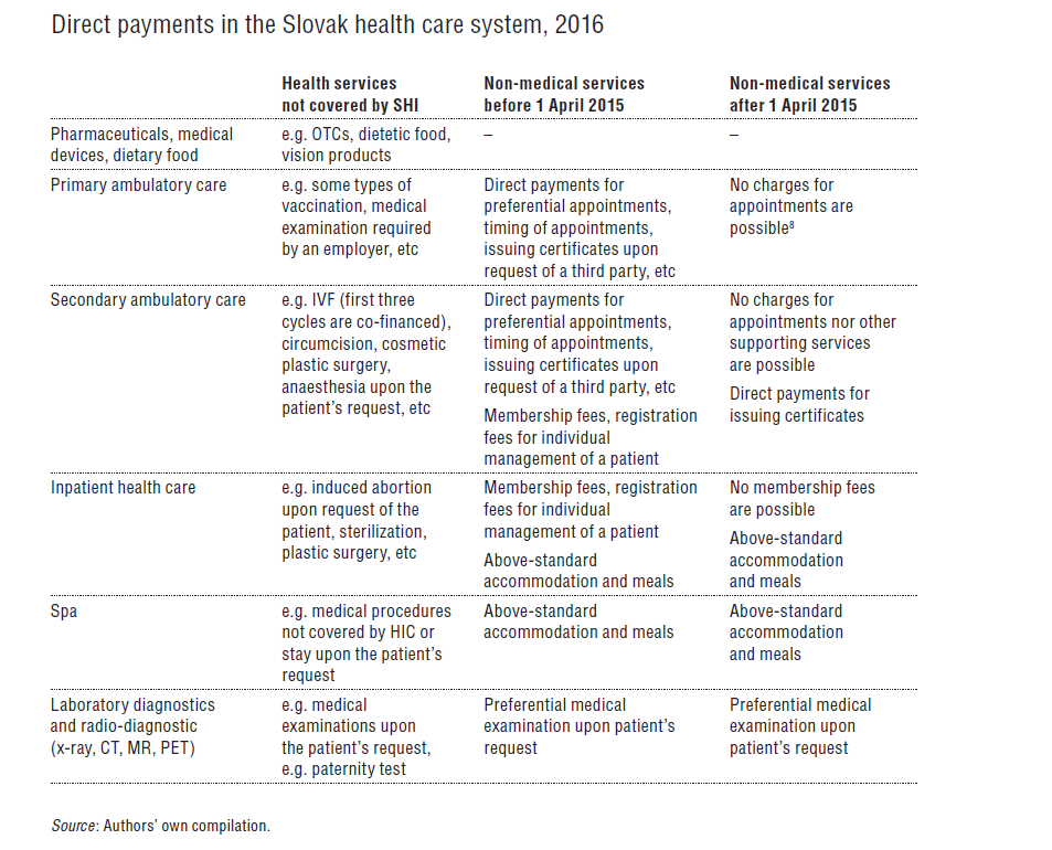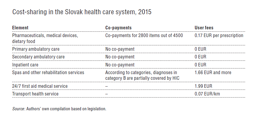| During provision | Fees for services related to care provision. | Regulated in §38 of Act 577/2004 in which Slovakia’s Constitutional Court confirmed that such charges are constitutional. |