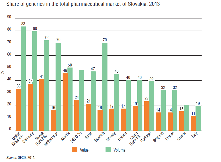 Out of 4415 medicines reimbursed under health insurance during the first half of 2016, 2573 (i.e. 58%) were registered as generics. According to the OECD (2015), 72% of all medicines that were partially or fully reimbursed in 2013 were generics, which accounted for roughly 41% of total pharmaceutical sales in the country. These values are some of the highest among OECD member countries (see Fig2.5).