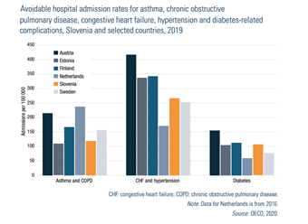The indicator of avoidable admissions to hospitals is often used to gauge the strength and quality of primary care. Potentially preventable hospitalizations are admissions to a hospital for certain acute illnesses or chronic conditions, such as asthma, COPD, congestive heart failure, hypertension and diabetes, that might not have required hospitalization had these conditions been managed successfully with good outpatient care, especially at the primary level. By this measure, Slovenia fares well compared with other European countries (Fig7.5).