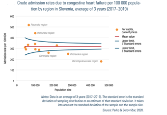 However, the crude admission rates vary significantly by region. The Podravska region is an outlier in terms of admissions due to COPD and asthma, while the Pomurska region is an outlier in admissions due to congestive heart failure (Fig7.6) and hypertension. In all these cases, admission rates are higher than expected, though the Osrednjeslovenska region has a lower than expected rate of admission on three out of the four conditions considered (Perko & Borovničar, 2020). Despite the use of a funnel plot to identify outliers,[10] caution is necessary in the interpretation of these data. First, the data are not adjusted by sex and age, or by the regional prevalence of these conditions. Secondly, different admission rates may be due to different practices in labelling the primary diagnosis in the various hospitals. Thirdly, different admission rates may be due to differences in bed (or staff) availability in regional hospitals.