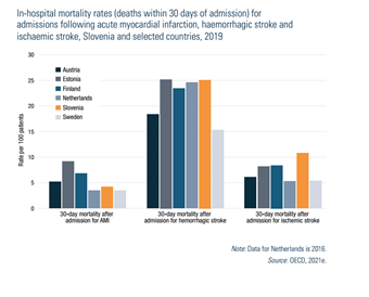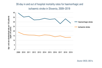 The quality of hospital care in Slovenia is difficult to assess as performance varies, depending on the condition or indicator considered. Compared with other selected countries, the standardized 30-day hospital mortality rate for AMI is low (Fig7.7). Indeed, it is the second lowest in Europe at 4.2 per 100 patients after the Netherlands and Sweden (3.5 per 100 patients each). However, the rate of 30-day mortality following both ischaemic and haemorrhagic stroke is concerning; Slovenia had some of the highest in-hospital case-fatality rates in Europe in 2009 (OECD, 2012a). Since then, the values have improved for both conditions (Fig7.8). Nonetheless, the country has still above average values, as compared with selected countries and the EU.