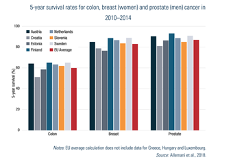 Slovenia’s HSPA report (see section 7.1) considered survival rates for colorectal, breast, lung, prostate, cervical cancer and overall cancer survival rates (Perko et al., 2019; see also Fig7.9). It found most of these indicators were improving. However, the overall survival rate was worse than the EU average. A notable exception was cervical cancer survival, which was stable at a better than EU average rate. The HSPA report included a few other indicators in the quality and safety domain: infant mortality rates, admission-based diabetes-related lower extremity amputations rates, 30-day mortality for AMI and stroke and use of second line antibiotics. The overall assessment of health care quality was good (Perko et al., 2019).