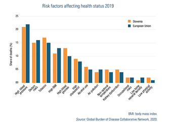 The burden of noncommunicable diseases is high. Circulatory diseases, followed by cancers, are the most common causes of death, accounting for 40% and 33% of mortality, respectively, in 2018. Other noncommunicable diseases cause 13% of further deaths (NIJZ, 2018). Looking at more specific diseases, stroke and ischaemic heart disease were the leading causes of mortality in 2018 (about 10% of all deaths each), followed by lung cancer (6%) (OECD/EOHSP, 2021).