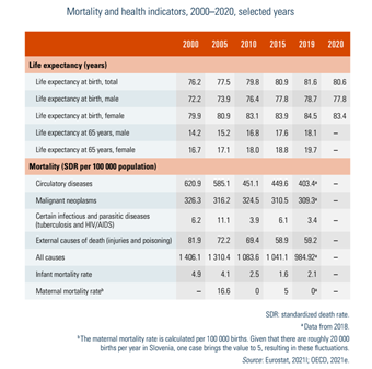 Since 2020 and the COVID-19 pandemic and its high fatality rates, mortality and excess mortality has received a lot of attention across countries. In retrospect, we can now say that mortality due to COVID-19 was extremely high in the second wave of the epidemic, which hit Slovenia in autumn of 2020. The first wave had low incidence and mortality rates, so the impact of the epidemic in spring 2020 was minimal. It is estimated that around 3900 people died due to and with COVID-19 in 2020 overall, mainly in autumn 2020. That is almost 20% of the average absolute mortality in a year. Excess mortality in November 2020 reached between 66% and100% above average levels (1). The curves for mortality for COVID-19 and excess mortality were quite close to each other, indicating that most excess mortality was probably due to COVID-19. The situation repeated to a much lesser degree late in 2021, when excess mortality exceeded the pre-COVID-19 levels by a maximum of 50% and where the impact of COVID-19 was still significant but not to the same degree as in 2020.
