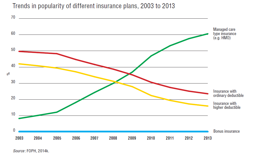 Since 2003, the MHI market has undergone an impressive transformation, with an increasingly large proportion of insured opting for managed care type insurance (see Fig3.8). By 2013, more than 60% of insured had managed care type insurance, while this proportion was below 10% in 2003. However, managed care type insurance plans may in fact be combined with higher (optional) deductibles and 34.3% of insured with managed care type insurance plans had an optional deductible, which is not reflected in the figure.