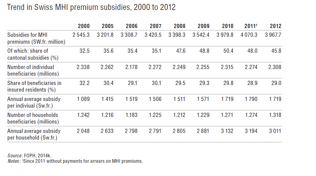 The number of individuals receiving premium subsidies and paying only a reduced premium or no premium at all has remained relatively stable at around 2.3 million, corresponding to 29.0% of the Swiss population in 2012 (see Table3.4). About 0.5 to 0.6 million people are estimated to pay no premium at all, although the exact number of persons or households is unknown.