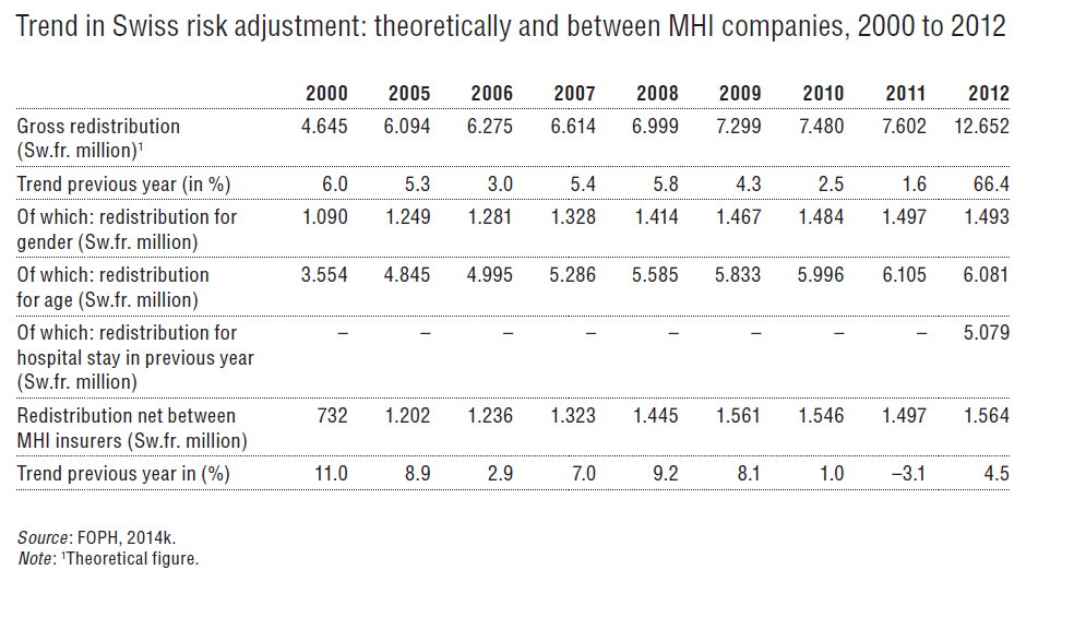Until the end of 2011, the risk-adjustment formula was based only on age and gender. The formula consisted of 30 age and gender categories (15 age groups and 2 gender categories), and financial flows from the Common Institution to MHI companies ensured that available resources per insured person within one of these categories were the same across MHI companies operating within the same canton. However, it was generally acknowledged that risk selection was widespread under this “old” risk equalization formula (van de Ven et al., 2013).