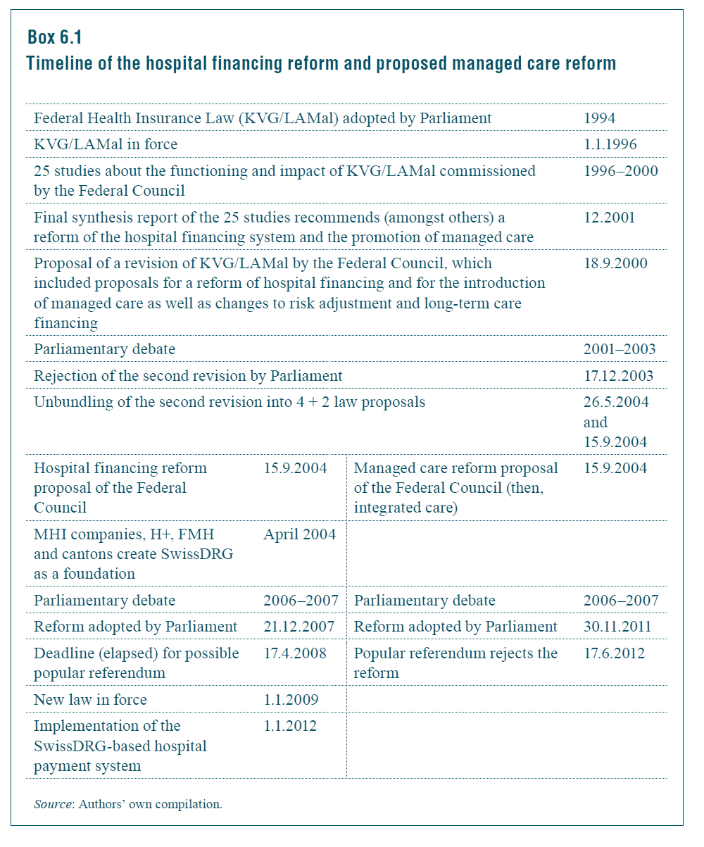 Before discussing these reforms in more detail, section 6.1.1 describes the context and origin of several of these reforms to illustrate the long, difficult and not always successful political processes of making health reforms in Switzerland.