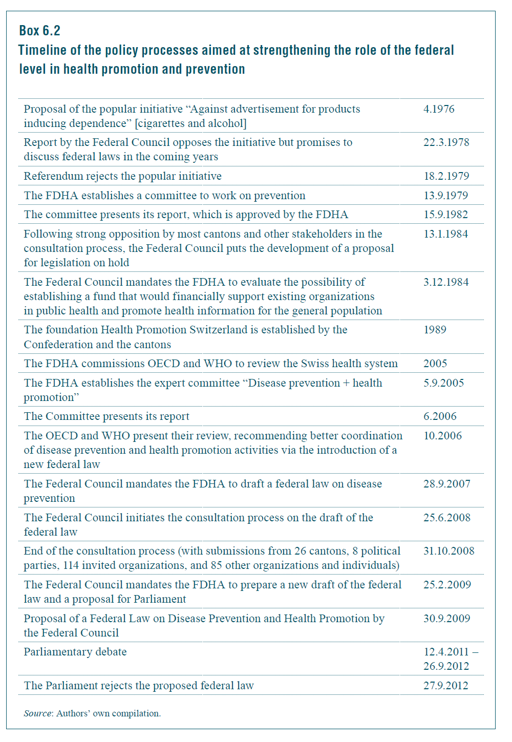 Box6.2 shows a timeline of attempts aimed at strengthening the role of the federal government in disease prevention and health promotion. In 1976, a popular initiative aimed to ban advertising for cigarettes and alcohol by adding an article to the Federal Constitution. Despite its rejection in 1979, the initiative kicked off federal activities in the area of disease prevention and health promotion, such as the establishment of committees and the publication of reports. One early result of these developments was the establishment of the foundation Health Promotion Switzerland in 1989.