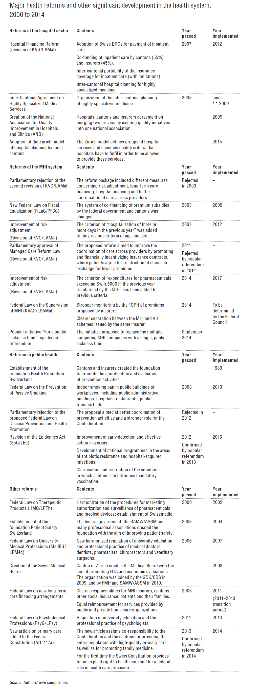 Table6.1 summarizes major reforms and reform attempts as well as other significant developments that occurred in the health system between 2000 and 2014. As KVG/LAMal is the most important federal law outlining the basic characteristics of the health system (see section 2.1), most reforms are, in fact, revisions of KVG/LAMal. The most important areas of reform were: