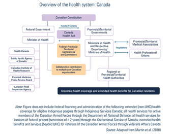 Although the three northern territories have a constitutional status that is subsidiary to the federal government, they have been delegated responsibility for administering public health care by the federal government. The federal government retains important “steering” responsibilities in terms of key dimensions of medicare through the Canada Health Act, the principles of which are upheld by provinces wanting to receive their full share of the Canada Health Transfer (see Fig2.1). By not taxing health benefits through employment-based insurance, the federal government also provides an implicit subsidy to encourage private health insurance coverage for non-medicare health services and pharmaceuticals. Fig2.1 is a highly simplified overview of the governance of publicly financed health care in Canada.