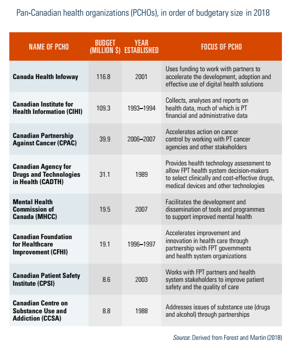 As a decentralized state operating in an environment of increasing health policy interdependence, the FPT governments rely heavily on intergovernmental instruments to facilitate and coordinate policy and programme areas (Marchildon, 2010). Direct instruments include the (FPT) advisory councils and committees that report to the Conference of FPT Deputy Ministers of Health, which in turn report to the Conference of FPT Ministers of Health (O’Reilly, 2001). The federal government also provides funding for a number of specialized Pan-Canadian Health Organizations (PCHOs) which are summarized in Table2.4. In 2018, an external review panel (Forest & Martin, 2018) suggested major changes to the PCHOs including some potential mergers among the organizations, but at the date of writing, there have not been major changes to these PCHOs with the exception of the amalgamation of the Canadian Patient Safety Initiative and the Canadian Foundation for Healthcare Improvement in 2020 (Canadian Foundation for Healthcare Improvement, 2020a).