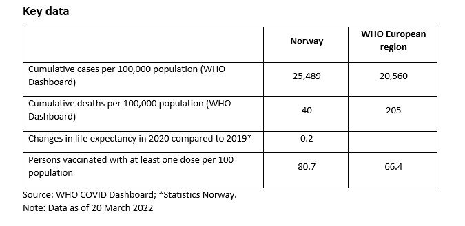Immunization in the national vaccination programme is voluntary and without co-payment in Norway. The COVID-19 vaccination was included in October 2020. The NIPH is responsible for the national vaccination programme, in collaboration with the municipalities, and was mandated by the Government to organize the necessary planning efforts to immunize the population against COVID-19, once one or more vaccines were approved. Due to limited availability, COVID vaccination was initially available only to priority groups, and subsequently rolled out according to the priority set in the vaccination strategy. As of 20 March 2022, 80.7% of the population had received at least one dose of vaccination.