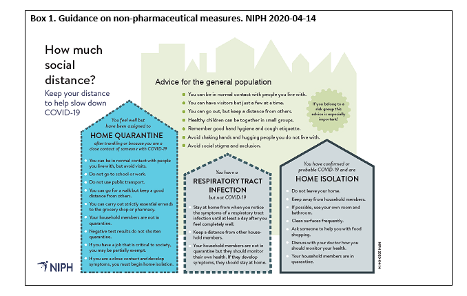 Social distancing and restrictions on travel have been central elements in the handling of the pandemic in Norway. The NIPH emphasized the need to keep attention on physical distance in all possible circumstances, as well as proper hand hygiene and coughing etiquette.